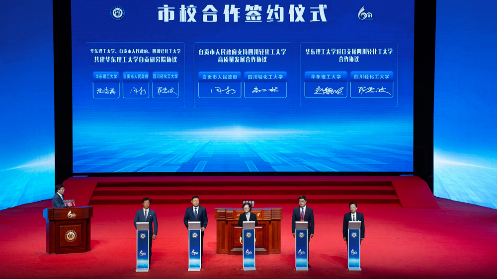 大会举行了隆重的签约仪式,标志着学校在校地、校校及产教融合方面开启新篇章。学校与自贡市人民政府、华东理工大学签署了一系列重要合作协议,包括《自贡市人民政府支持四川轻化工大学高质量发展合作协议》《华东理工大学对口支援四川轻化工大学合作协议》以及三方《共建华东理工大学自贡研究院协议》。自贡市副市长周耘,华东理工大学党委副书记沈海涛、副校长赵黎明,四川轻化工大学副校长高小林、罗惠波作为代表上台签约。此举将深化校地合作,构建与兄弟院校的全方位战略合作新格局。