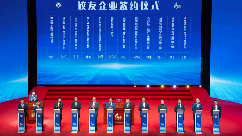 在校友企业签约环节,合作覆盖新材料、矿山机械、彩灯、低空经济等新兴领域。川恒股份、运机集团、锦美环保、众邦新材料、灯彩集团、海天彩灯、臻骋航空、益丰鑫能源、爱朵集团、芯图科技、成都星辰等由校友掌舵或代表的企业踊跃参与,彰显了广大校友心系母校、反哺发展的深厚情谊与共赢愿景。